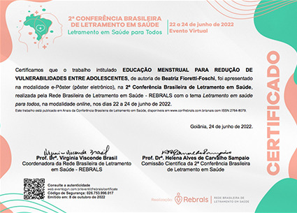 O método Os Segredos de Alice foi selecionado, apresentado e está publicado nos anais da 2ª REBRAUS – Conferência Brasileira de Letramento em Saúde/2022