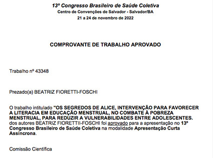 A comissão científica selecionou o método Os Segredos de Alice para ser apresentado no 13º Congresso Brasileiro de Saúde Coletiva 2022